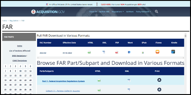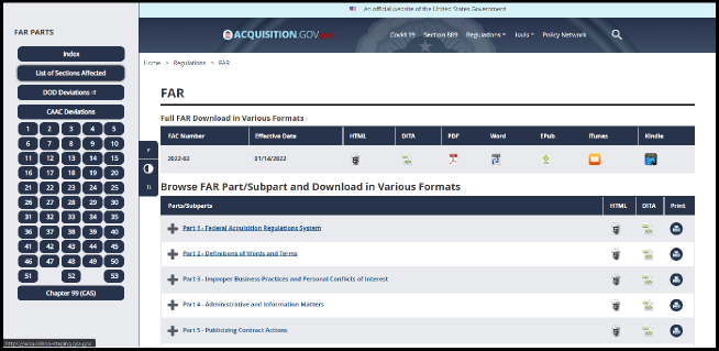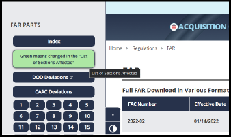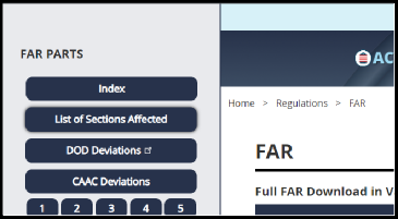 - In the previous version of Acquisition.gov, the FAR/GSAM and DFARS index page Part selection box on the left of the screen would remain stationary and take up a significant amount of space that could be used for text display. In the latest version, we have added a collapsible side menu button to push the menu off screen, and shift more regulation text into the text viewing field.