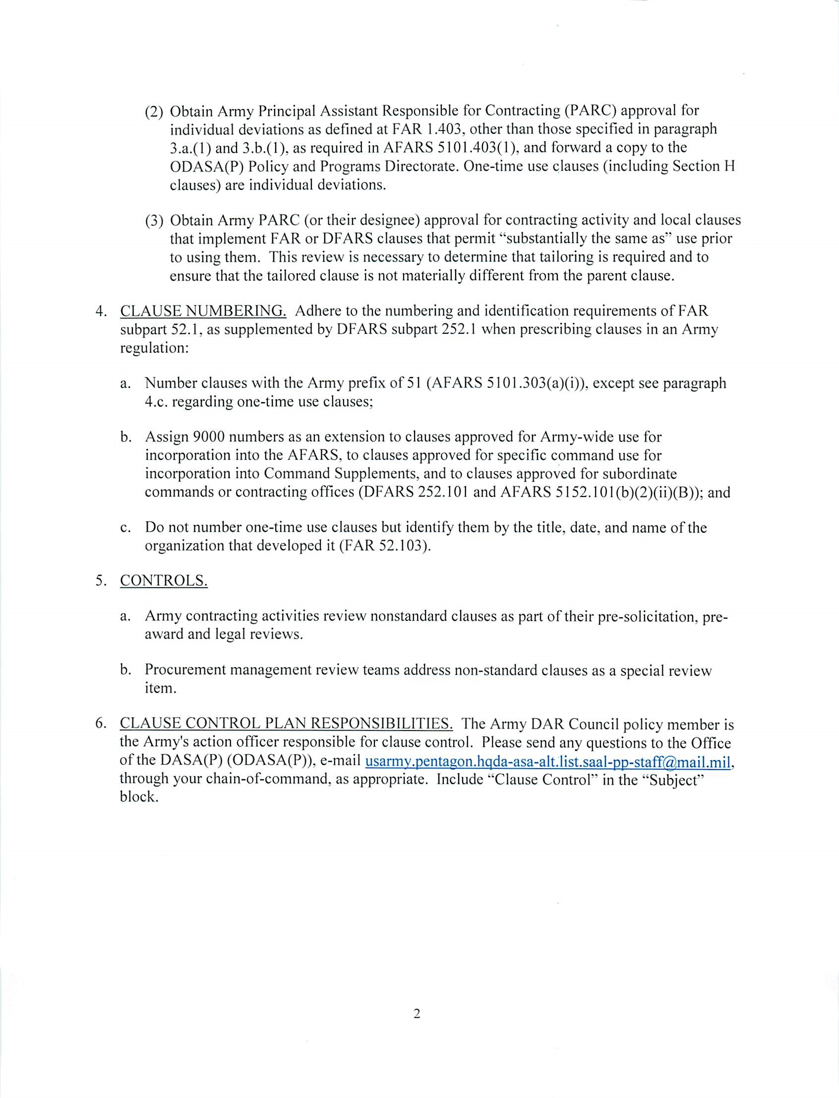 3. REVIEW AND APPROVAL OF NONSTANDARD CLAUSES. Army contracting activities coordinate all nonstandard clauses with the Office of the Deputy Assistant Secretary of the Army (Procurement) (ODASA(P)) Policy and Programs Directorate in accordance with Army Federal Acquisition Regulation Supplement (AFARS) 5101.304(1)(i). The ODASA(P) Policy and Programs Directorate coordinates with the Office of the Army General Counsel during review of nonstandard clauses.