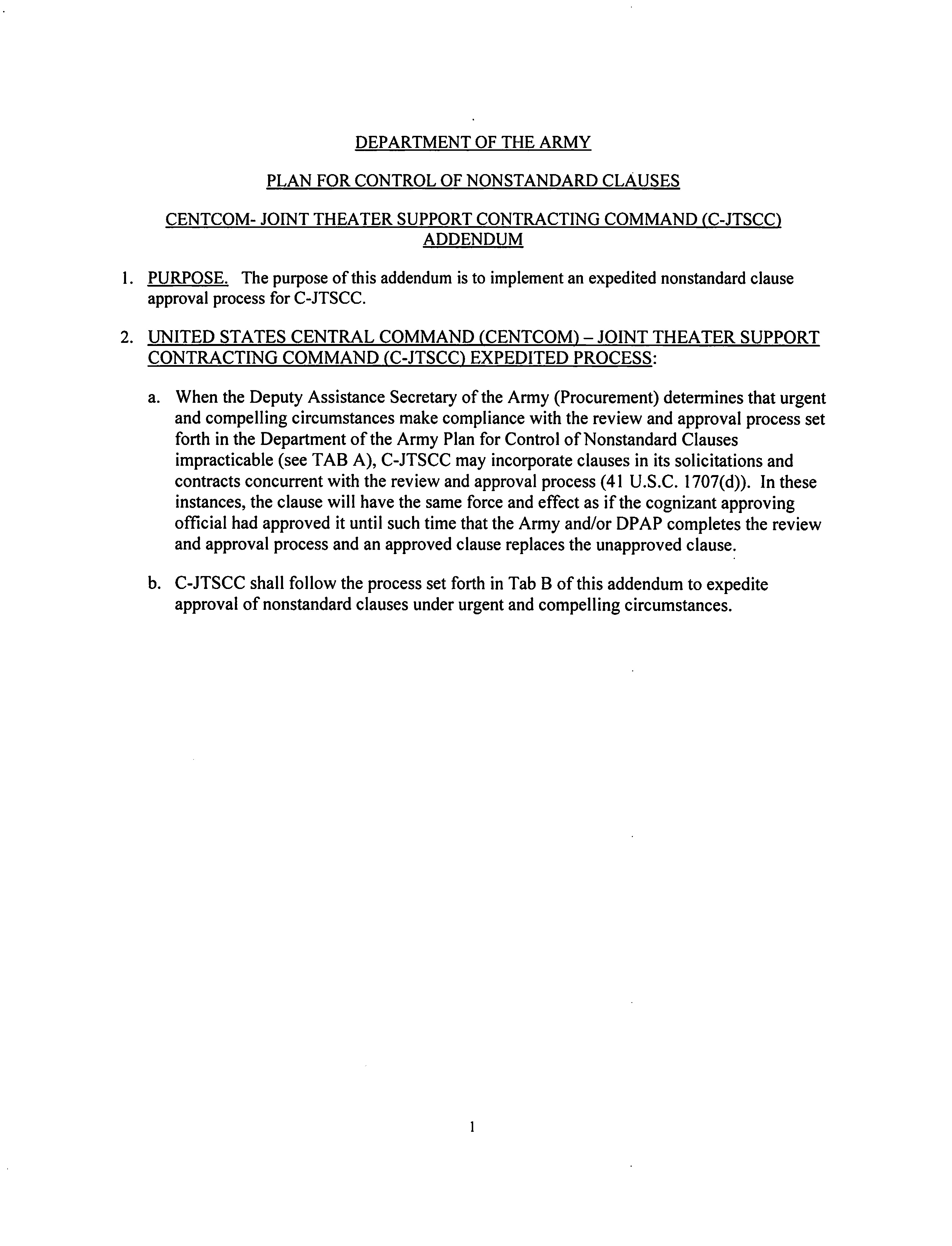 DEPARTMENT OF THE ARMY PLAN FOR CONTROL OF NONSTANDARD CLAUSES