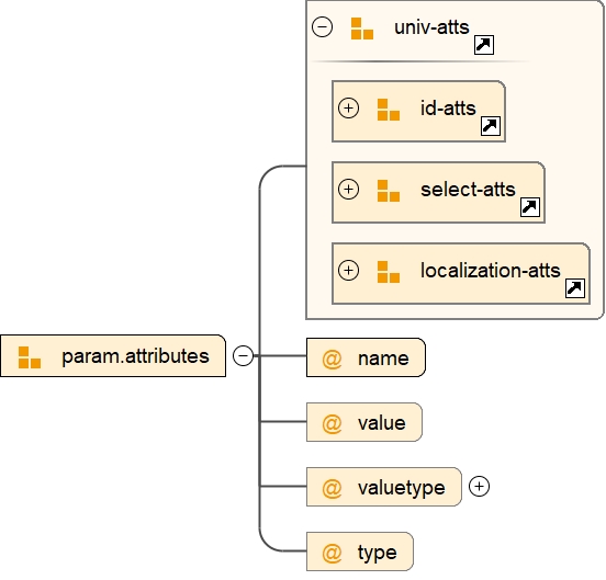 <xs:attributeGroup name="param.attributes"> <xs:attributeGroup ref="univ-atts"/> <xs:attribute name="name" use="required"/> <xs:attribute name="value"/> <xs:attribute name="valuetype"> <xs:simpleType> <xs:restriction base="xs:token"> <xs:enumeration value="data"/> <xs:enumeration value="object"/> <xs:enumeration value="ref"/> <xs:enumeration value="-dita-use-conref-target"/> </xs:restriction> </xs:simpleType> </xs:attribute> <xs:attribute name="type"/> </xs:attributeGroup> |