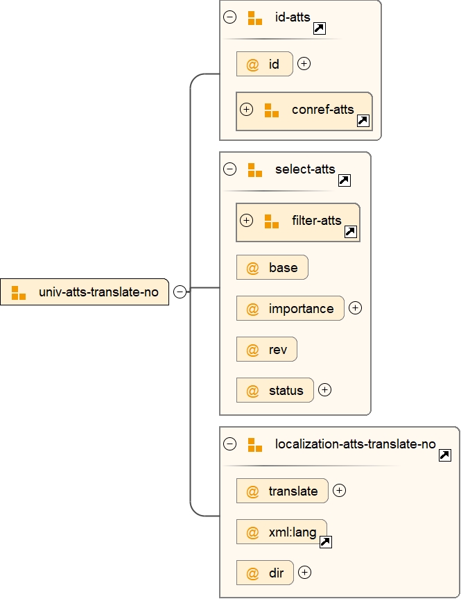 <xs:attributeGroup name="univ-atts-translate-no"> <xs:attributeGroup ref="id-atts"/> <xs:attributeGroup ref="select-atts"/> <xs:attributeGroup ref="localization-atts-translate-no"/> </xs:attributeGroup> |