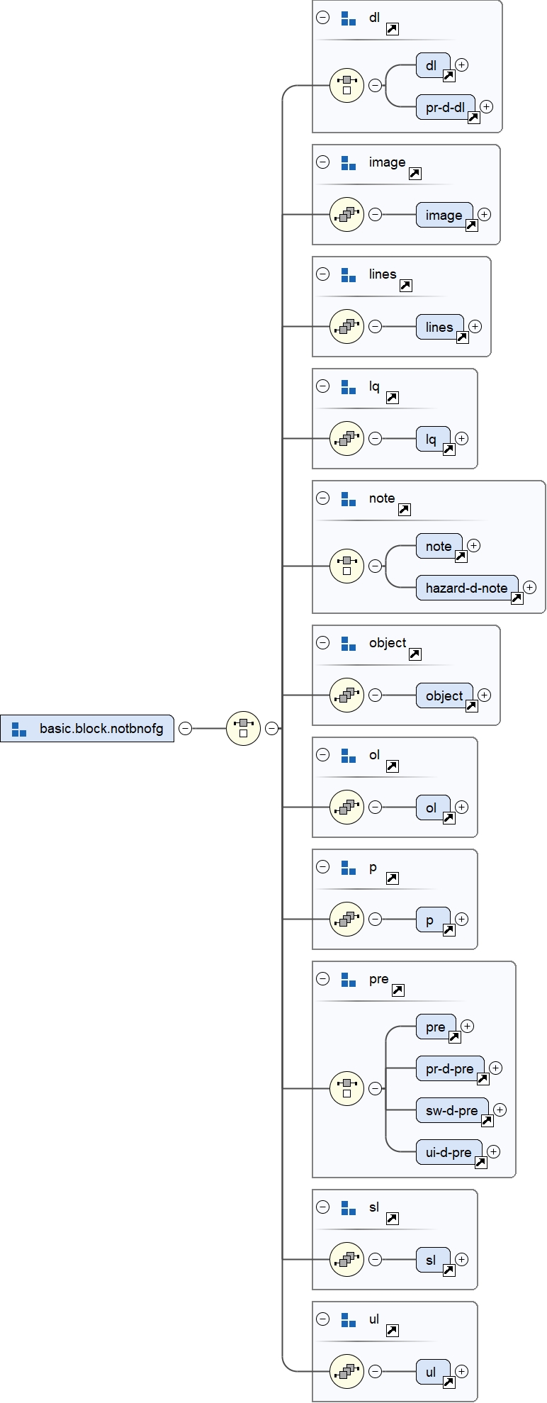 <xs:group name="basic.block.notbnofg"> <xs:choice> <xs:group ref="dl"/> <xs:group ref="image"/> <xs:group ref="lines"/> <xs:group ref="lq"/> <xs:group ref="note"/> <xs:group ref="object"/> <xs:group ref="ol"/> <xs:group ref="p"/> <xs:group ref="pre"/> <xs:group ref="sl"/> <xs:group ref="ul"/> </xs:choice> </xs:group> |