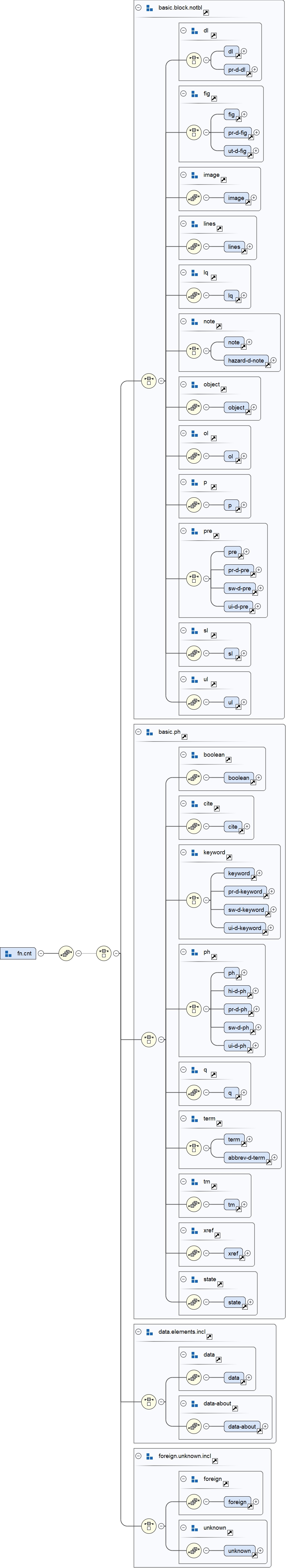 Element Group fn.cnt Namespace No namespace Diagram Used by Complex Type Complex Type fn.content Element Element fn Model (Element dl | Element pr-d-dl | Element fig | Element pr-d-fig | Element ut-d-fig | (Element image) | (Element lines) | (Element lq) | Element note | Element hazard-d-note | (Element object) | (Element ol) | (Element p) | Element pre | Element pr-d-pre | Element sw-d-pre | Element ui-d-pre | (Element sl) | (Element ul) | (Element boolean) | (Element cite) | Element keyword | Element pr-d-keyword | Element sw-d-keyword | Element ui-d-keyword | Element ph | Element hi-d-ph | Element pr-d-ph | Element sw-d-ph | Element ui-d-ph | (Element q) | Element term | Element abbrev-d-term | (Element tm) | (Element xref) | (Element state) | (Element data) | (Element data-about) | (Element foreign) | (Element unknown)) Children Element abbrev-d-term, Element boolean, Element cite, Element data, Element data-about, Element dl, Element fig, Element foreign, Element hazard-d-note, Element hi-d-ph, Element image, Element keyword, Element lines, Element lq, Element note, Element object, Element ol, Element p, Element ph, Element pr-d-dl, Element pr-d-fig, Element pr-d-keyword, Element pr-d-ph, Element pr-d-pre, Element pre, Element q, Element sl, Element state, Element sw-d-keyword, Element sw-d-ph, Element sw-d-pre, Element term, Element tm, Element ui-d-keyword, Element ui-d-ph, Element ui-d-pre, Element ul, Element unknown, Element ut-d-fig, Element xref Source <xs:group name="fn.cnt"> <xs:sequence> <xs:choice minOccurs="0"> <xs:group ref="basic.block.notbl"/> <xs:group ref="basic.ph"/> <xs:group ref="data.elements.incl"/> <xs:group ref="foreign.unknown.incl"/> </xs:choice> </xs:sequence> </xs:group> Parent topic: Element Group