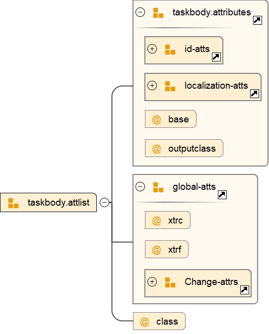 <xs:attributeGroup name="taskbody.attlist"> <xs:attributeGroup ref="taskbody.attributes"/> <xs:attributeGroup ref="global-atts"/> <xs:attribute name="class" default="- topic/body task/taskbody "/> </xs:attributeGroup> |